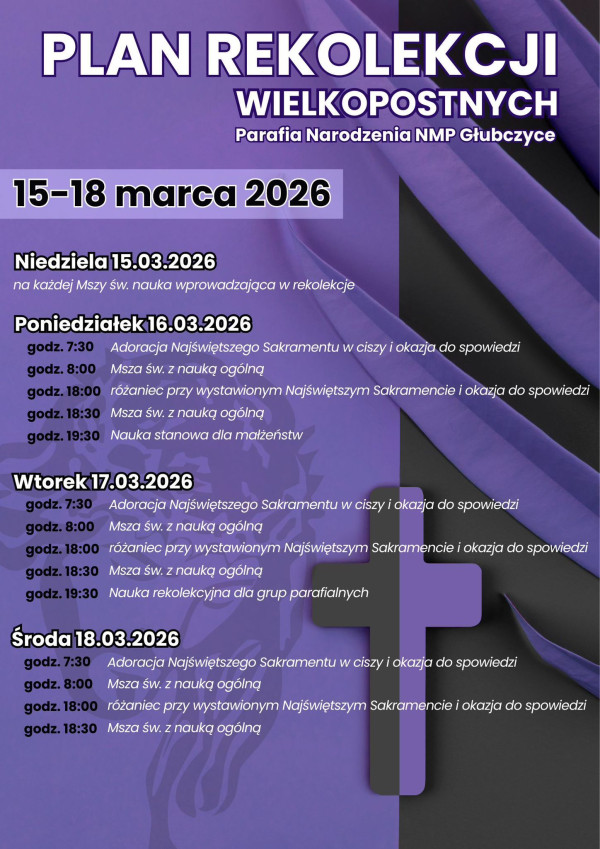 - O 16.00 Nabożeństwo "Godziny Świętej" prowadzone przez Czcicieli Miłosierdzia Bożego. W związku z tym nabożeństwem nie będzie nieszporów niedzielnych o g. 18.00.